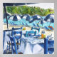 De un cuadro original en acrílico, de Yvonne Ayoub, de las sillas azules de la Taverna, tumbonas y sombrillas en la playa de Kolios, Skiathos, Grecia