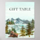 Por la mesa de regalo en la ducha de bebé. Este diseño tiene montañas rústicas de color acuático con un lago reflectante delante y pinos que rodean el lago. Oso adulto con su cachorro delante. Texto de "Regalo" en la parte superior.