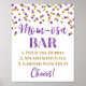 Poster de signos de barra de Momosa para la ducha de bebé con un patrón de confeti blanco, morado oscuro y dorado con letras de estilo manuscrito. Perfecto para las duchas y la rociada de bebés.