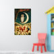 Un bonito afiche de época con demonios, una bruja y un personaje de calabaza bailando bajo la luna y un búho.