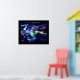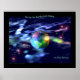 Poster con mi arte digital del planeta Tierra en el espacio rodeado de auroras coloridas, estrellas y notas musicales con texto "el día que la Tierra deje de cantar, dejaremos de bailar".
