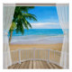 Disfruta cada día con la vista de tener un balcón con vistas al mar. Gracias a PEXELS por el uso comercial gratuito de fotos de una palmera y una escena oceánica, Holbrook Art usó técnicas digitales de pintura al óleo para modificarlas y pintarlas a través de cortinas y un balcón para crear una vista de frente realista de la playa y el océano como se ve desde un dormitorio de un resort.