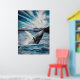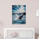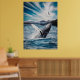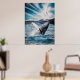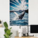 Imagen de una ballena que se desliza con montañas nevadas y bosques en el fondo junto con una bandada de pájaros voladores en el cielo.
