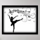 Silueta negra simple de una bailarina de ballet con barra de música y notas de lujo