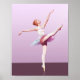 Esta pintura digital muestra a una joven bailarina en rosa, lavanda y blanco golpeando una hermosa pose. La bailarina tiene el pelo rojo. Ella está en los dedos de los pies con una pierna estirada frente a ella y un brazo levantado. El fondo está decorado en tonos azules. Personalizar añadiendo un título, nombre o monograma propios.