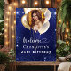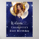 Un poster de bienvenida para una fiesta de cumpleaños glamurosa y femenina de 21 años (o de cualquier edad). Un fondo azul marino con elegantes chispas falsas y globos dorados. El color azul es desigual. Personalice y agregue un nombre, edad. Añadir una foto al marco del globo. Letras blancas. Bienvenidos con corazón.