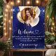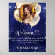 Un poster de bienvenida para una fiesta de cumpleaños. Un fondo azul marino con elegantes chispas falsas y globos dorados. El color azul es desigual. Personalice y agregue un texto de bienvenida de nombre y edad. Añadir una foto al marco del globo. Letras blancas. Bienvenidos con corazón.