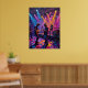 Esta pintura captura una banda de rock and roll que actúa en vivo en un escenario luminoso. El arte se caracteriza por su textura de gran dificultad, con pinceles gruesos y expresivos que transmiten la atmósfera energética y dinámica de un concierto. Dos guitarristas ocupan un lugar destacado en el primer plano, mientras que un bajista y un tamborilero pueden verse al fondo bajo vibrantes luces azules, violetas y amarillas. Toda la escena es una celebración de música y actuación.