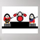 Una adorable banda de pingüinos. Un pingüino toca la guitarra. Otro pájaro toca el bajo y un tercero toca los tambores.