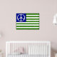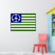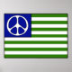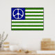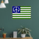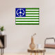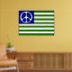 Bandera azul, blanca y verde con un símbolo de paz en lugar de las estrellas dice que la Paz debe ser parte de salvar el planeta porque la guerra es una fuerza destructiva que nos afecta a nosotros y al planeta. Difundir el mensaje de que poner fin a la guerra salvará a la tierra.