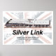 Locomotora de vapor LNER Clase A4 2509 Silver Link con bandera de la Union Jack del Reino Unido en perfil o vista lateral. Esta locomotora histórica de vapor, Silver Link, operó en la London and North Eastern Railway desde 1935 hasta 1963. Conocida por su diseño elegante y potente motor, simbolizó la edad de oro del viaje en tren. Una representación clásica del patrimonio ferroviario británico, preservada en elegancia atemporal y excelencia en ingeniería.