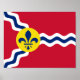 Poster con bandera de la ciudad de St. Louis; bandera roja con olas blancas y azules y fleur-de-lys azules en círculo amarillo