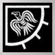 Un ilustracion blanco y negro de la bandera del Raven que ondeaba guerreros y chozas.