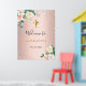 Una elegante pizarra de bautismo de niñas que acoge a una niña. Un rosa de oro falso de aspecto metálico. Decorada con grandes flores de color agua, flores y diamantes falsos. Personalice y agregue el nombre del niño. Texto de color negro y dorado.