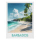 Tropical illustration of Barbados showing an empty beach lined with palm trees, cliffs, and a bright turquoise sea under a sunny sky. A perfect poster for vacation-themed wall decor.