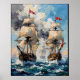 Esta pintura dinámica representa dos grandes barcos a vela que navegan por un mar tormentoso. La obra se caracteriza por su textura de impasto pesado, con pinceladas gruesas y expresivas que capturan las olas agitadas y espumosas y las nubes turbulentas. Ambos barcos, con sus banderas rojas y velas desplegadas, se muestran en movimiento, creando un sentido de dramatismo y un ambiente marítimo histórico. El cielo oscuro y nublado y el océano agitado añaden a la atmósfera intensa y aventurera de la escena.