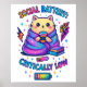 Diseño vibrante y colorido con un gato acogedor envuelto en una manta, sentado al lado de un montón de libros tomando café. El colorido texto dice: "Batería social críticamente baja". Este diseño está disponible en una amplia variedad de productos.