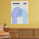 Minimalist Bauhaus-style poster featuring geometric blue circular patterns, advertising the 1923 exhibition held from July to September.
