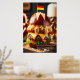 Podrá disfrutar de una deliciosa cocina de Baviera con esta hamburguesa alemana. Una gruesa parrilla de ternera infundida por las salchichas, a la perfección, está recubierta de queso de gouda fundido, chucrut con salsa agria y una generosa difusión de mostaza de grano entero. Todo enclavado en un bollo de pretzel recién horneado. Una pequeña bandera alemana le da un toque bávaro, mientras que un fondo borroso exhibe una helada de cerveza, completando la escena festiva.