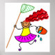 Un lindo personalizado caprichoso de una niñita en la playa con su red de pesca y su balde de agua lista para poner sus criaturas marinas en la playa.