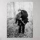 Vieja foto de un cazador con un arma en el bosque cargando un oso grande, 1909.