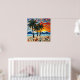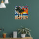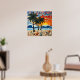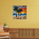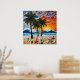 An impasto oil painting style ai illustration of a beach full of palm trees, sea glass, sea shells and ocean waves at sunset. A bright colorful mesh of colors make this coastal art vibrant and beautiful!