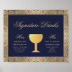 Una elegante señal de bebidas de firma vintage, recomendada para una boda con colores de boda azul marino y dorado. El fondo es azul marino. Tiene bordes dorados florales con decoraciones intrincadas de rosas silvestres. Todo el texto es dorado. El título Bebidas de Firma y los subtítulos "Ella" y "Él" están escritos en una elegante letra caligráfica, el resto en mayúsculas. En el centro, entre los cócteles de Ella y Él, hay una copa de vino de lámina dorada falsa.