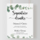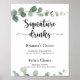 Este cartel de bebidas destacadas verde eucalipto es perfecto para una boda sencilla. El diseño presenta ramas y hojas de eucalipto botánico elegante dibujado a mano con acuarela. Personalice el cartel con los nombres de los novios y su bebida favorita.