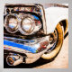 El coche clásico americano de 1950. Vista parcial de los faros, la rueda delantera y un parachoque