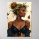 A lo lejos, una impresionante joven adornada con delicadas miradas florales en la corona, rodeada de floridas mariposas doradas. Su elegante conjunto de encaje negro contrasta maravillosamente con su piel brillante, evocando un sentido de gracia natural y misterio. Los tonos cálidos y suaves del fondo dan un toque de fantasía y encanto al lugar.