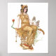 Exótica belleza oriental de cabello oscuro en estilo Art Nouveau con túnicas doradas en silla elaborada con iris. El ilustracion victoriano restaurado presenta detalles en tonos dorados falsos y un color de fondo editable.