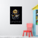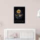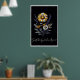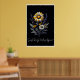 Este poster presenta un llamativo arreglo floral con un fondo negro profundo, creando un contraste dramático que hace que las flores parezcan brillar. La parte central es una gran flor de margarita con pétalos blancos y naranjas dorados que se alternan alrededor de un centro amarillo texturado. Debajo hay una pequeña margarita blanca con un centro amarillo. El arreglo incluye altos tallos de lavanda morada a ambos lados, lo que añade altura y un color contrastante. Las caléndulas doradas más pequeñas o las flores de caléndula de oro añaden palos adicionales de naranja amarillo vibrante a lo largo de toda la composición. Las flores están acompañadas de hojas gris plateado y pequeñas flores de acento blanco que se parecen al encaje de la Reina Ana.