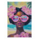 un retrato impresionante y vibrante de una mujer de diseño con gafas de sol rosas gigantes que reflejan una playa tropical de ensueño. Rodeada de suaves flores de hibisco y con un fondo oceánico turquesa, esta obra de arte captura la esencia del verano, la belleza y el empoderamiento. Ideal para los amantes de la playa, los coleccionistas de arte vanguardista y la decoración tropical.