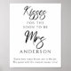 Besos personalizados para la Poster de juegos de ducha de novia Mrs Bridal Shower - Un poster moderno, sencillo y de moda para juegos de ducha con novia que incluye texto de tipo de letra de guión y un elegante tipo de letra de bloque con paleta de color blanco y negro. Personalice agregando el apellido de la novia al futuro. Para una variedad de temas de ducha de novia, ya sea que esté planeando una ducha nupcial en primavera, verano, otoño o invierno, brunch de novias en interiores o exteriores. Edite las instrucciones del juego para adaptarlas a sus necesidades del fiesta. Disponible como poster impreso o descarga digital instantánea para imprimir en casa. Coloca este poster en tu marco favorito y verás tu pantalla como parte de la decoración de tu ducha de novia.