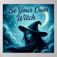 This whimsical poster features mystical artwork of a witch in a starry night sky with a crescent moon, symbolizing empowerment and embracing one's unique magical identity. Finished as a mixed media art print.