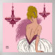 Nuestra hermosa Bianca de pelo rubio, vestida de blanco y rosa. Bianca está adornada con joyas y tiene un polvoriento ventilador de plumas rosa. Las lámparas de araña de Borgoña con fondo rosa claro.
