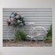 Una bicicleta de playa antigua pintada de blanco con flores de hidrangea rosas y azules en la canasta y apoyada contra una pared de madera gris es bonito, nostálgica y evoca recuerdos de vacaciones costeras y tiempos inocentes.