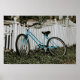 Póster Bicicleta turquesa inclinada sobre una cerca blanc