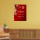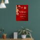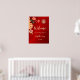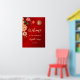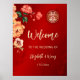 Este colorido mostrador de recepción de bodas chino cuenta con flores de peonía y un símbolo de doble felicidad dorado sobre un fondo rojo rubí resplandeciente. Con un texto de bienvenida boda en un guión elegante escrito a mano.