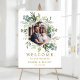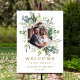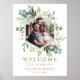Este signo de bienvenida boda (poster) presenta eucalipto de acuarela pintado, hojas verdes y una foto con un marco falso hexágono de oro. Para una personalización más avanzada de este diseño, haga clic en el enlace "Personalizar más adelante". También están disponibles los elementos coincidentes.