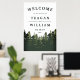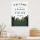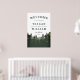 Bienvenido a su boda rústico, forestal o montañés con nuestro poster Tall Pines, que cuenta con un borde de pinos verdes en el fondo, en ricos tonos de verde cazador. Agregue sus nombres, fecha de boda y texto de bienvenida personalizado usando los campos proporcionados.