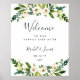Bienvenido a tu boda con nuestro poster Alabaster Floral, con una exuberante vegetación botánica de acuarela y flores blancas, con "bienvenidos a nuestro más feliz para siempre", tus nombres, y fecha boda en una moda mezcla de modernos tipos de caligrafía en bloques y a mano.
