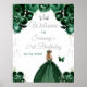 Este elegante y glamoroso cartel de bienvenida para la fiesta de cumpleaños muestra a una bella princesa con el pelo rubio en un vestido de bolas verde oscuro. El texto combina el guión manuscrito y las fuentes sans serif modernas para un aspecto elegante y sofisticado. Los arreglos florales, mariposa y confitis dorada crean la mezcla perfecta entre rústico y moda. Gráficos de www.etsy.com/uk/shop/SunflowerDayLove