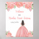 Este dulce cartel de bienvenida de dieciséis años tiene flores florales rosas purpurinas falsas y una hermosa princesa con el pelo castaño y un vestido elegante. Es perfecto para una dulce fiesta de 16 años.