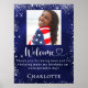 Un poster de bienvenida para una fiesta de cumpleaños. Un fondo azul marino con elegantes chispas finas de plata. El color azul es desigual. Personalice y agregue una foto, nombre y un texto de bienvenida. Letras blancas.