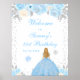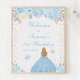 Este elegante y glamoroso cartel de bienvenida de la fiesta de cumpleaños de invierno presenta una hermosa princesa con el pelo rubio y piel clara en un vestido de pelota azul. El texto combina el guión manuscrito y las fuentes sans serif modernas para un aspecto elegante y sofisticado. Los arreglos florales, copos de nieve y confitis de plata crean la perfecta combinación de rústico y moda. Gráficos de www.etsy.com/uk/shop/SunflowerDayLove