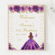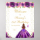 Este elegante y glamuroso cartel de bienvenida para la fiesta de cumpleaños incluye una hermosa princesa con el pelo rojo marrón y piel clara en un vestido de bola morada oscura. El texto combina el guión manuscrito y las fuentes sans serif modernas para un aspecto elegante y sofisticado. Los arreglos florales, las mariposas y los confeti dorados crean una perfecta mezcla de rústico y moda. Gráficos de www.etsy.com/uk/shop/SunflowerDayLove