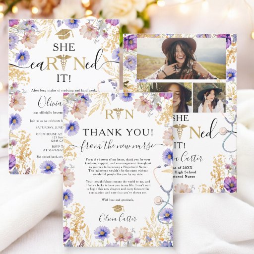 Celebra el trabajo duro y la dedicación de una enfermera recién registrada con este elegante cartel de bienvenida para graduación. Con delicadas flores silvestres en suaves tonos morados, azules y dorados, junto con un estetoscopio y el símbolo RN caduceus, este signo le aporta un toque personal y sofisticado a cualquier fiesta de graduación de la escuela de enfermería. Ideal para recibir a los clientes y para crear un bonito ambiente fiesta.