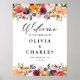 Bienvenido a su boda con este signo de bienvenida de boda floral. Cuenta con ilustraciones acuáticos de flores de naranja y borgoña con un jardín de follaje. Perfecto para bodas de otoño o otoño. Personalice agregando nombres y otros textos.