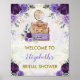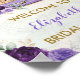 Letrero de bienvenida con tema de viaje para despedida de soltera, baby shower, boda, etc. con flores moradas de acuarela elegantes, maletas vintage y un globo lila precioso